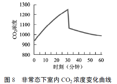 根據(jù)調(diào)研結(jié)果,非常態(tài)情況主要是陪伴人員和其他人員數(shù)量變化,屬于隨機變化情況。假設(shè)增加的人流量為陪伴人員3 人,持續(xù)時間為半小時。以正常新風(fēng)量供應(yīng)下的穩(wěn)定濃度933ppm 為起點,非常態(tài)情況下室內(nèi)人員數(shù)量為6 人,按照式(2)計算CO2濃度變化情況,可以發(fā)現(xiàn)CO2濃度呈上升趨勢,5 分鐘后室內(nèi)CO2濃度即超過1000ppm,抗沖擊能力為1/6,遠小于1;如設(shè)定診室要求的超限濃度限值為15 分鐘,則實際超限時間為52 分鐘,遠遠大于15 分鐘,故通過新風(fēng)調(diào)控判據(jù)認為常態(tài)新風(fēng)量不能滿足非常態(tài)下的新風(fēng)需求,需要加大新風(fēng)量。