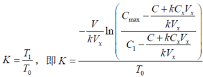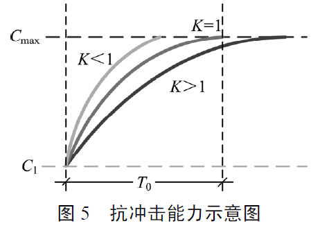 抗沖擊能力是無因次參數(shù),是指在非常態(tài)人流量情況下,CO2濃度由正??刂茲舛菴1 上升到報警濃度Cmax所需要的時間T1與非常態(tài)人流量持續(xù)時間T0 的比值,用參數(shù)K 表示,如圖5 所示,,式中Vx為常態(tài)人流量下的新風(fēng)供應(yīng)量,m3/h。