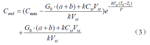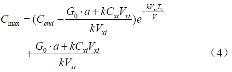 超限時間是指室內(nèi)CO2 濃度超過報警濃度的時間長度,包含非常態(tài)時段內(nèi)CO2濃度超過報警限值的時間段(T0-T1)及非常態(tài)結(jié)束后CO2濃度在常態(tài)新風(fēng)量供應(yīng)下又回落到報警濃度限值的時間段(T2)兩部分。非常態(tài)結(jié)束時刻室內(nèi)CO2濃度為式(3),然后在常態(tài)新風(fēng)量供應(yīng)下,CO2濃度回落到報警濃度,如式(4)。