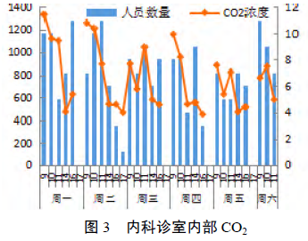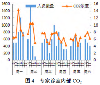 在測試時發(fā)現(xiàn)室內(nèi)開啟了機械新風(fēng)系統(tǒng),其新風(fēng)量為2h-1 換氣次數(shù),同時診室的門窗一直處于開啟狀態(tài)。由圖3 和圖4可以看出,診室內(nèi)部的人流量與室內(nèi)CO2濃度呈正相關(guān),在具有機械新風(fēng)系統(tǒng)供應(yīng)新風(fēng)及開啟外窗的情況下,診室內(nèi)部CO2 濃度在某些時段超過了《室內(nèi)環(huán)境空氣質(zhì)量標準》(GB/T18883-2002)規(guī)定的1000ppm 限值,具體表現(xiàn)在內(nèi)科診室是周一至周四的上午時段,最高達到了1300ppm,而專家診室則是在周一與周二,最高達到了1400ppm。與醫(yī)護人員訪談得知診室在周一與周二的上午時段室內(nèi)人員較多,空氣質(zhì)量較差,有醫(yī)護人員甚至發(fā)出“在這種悶悶的環(huán)境中怎么能打起精神來給患者看病”的感慨。由此可知,診室雖然開啟了新風(fēng)系統(tǒng)且新風(fēng)量為2h-1換氣次數(shù),診室內(nèi)部仍感覺空氣質(zhì)量不好,不得不打開外窗以引進新鮮空氣,在這種情形下室內(nèi)的空氣質(zhì)量仍有部分時段不佳。