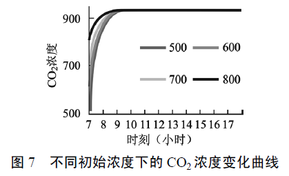 由圖7 可知,在人員CO2散發(fā)量為0.0144m3/(h·p),新風(fēng)CO2濃度為400ppm 下,對于不同的室內(nèi)CO2初始濃度,室內(nèi)CO2濃度最終穩(wěn)定在933ppm,穩(wěn)定時間大約為2 小時。