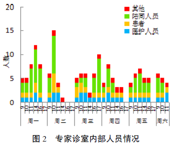 該醫(yī)院制定了門診就診管理制度,一次只允許一名患者和一名陪同人員進入診室,但從實際的情況來看,如圖1 與圖2,診室內(nèi)部的醫(yī)護人員和患者的數(shù)量比較穩(wěn)定,一般為三人,分別為一名醫(yī)生、一名助理和一名患者,而陪同人員數(shù)量較多且變化較大,陪同人員最少為0 人,最多為6~8 人。由此可知該醫(yī)院雖然設(shè)置了管理制度,但沒有嚴格執(zhí)行,導(dǎo)致了診室內(nèi)部人員遠遠偏離了正常情況。通過與醫(yī)護人員交談發(fā)現(xiàn),診室內(nèi)存在兩類不確定的人員,一類是正在診療患者的陪同人員,有時陪同數(shù)量較多,大約為5 人,尤其是兒童患者的陪同人員;另一類是正在等候診療的患者及其家屬(即圖中的“其他”人員),他們會擠進診室等待就診,雖然醫(yī)護人員讓這些等候人員在診室外等候,但效果并不明顯。