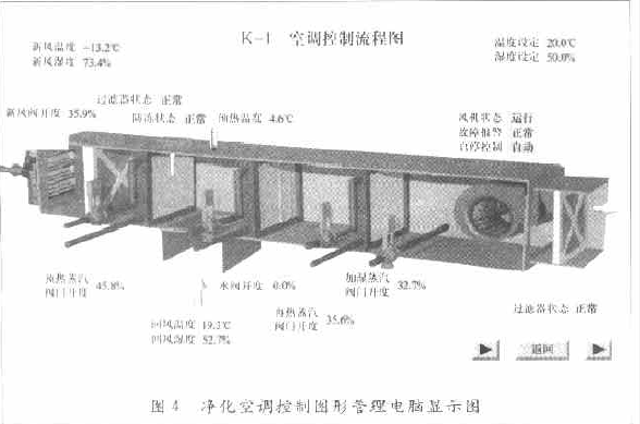 根據(jù)冷水機(jī)組是否投入使用以及室外氣候條件人為地將系統(tǒng)設(shè)定成冬季運(yùn)行工況、過(guò)渡季運(yùn)行工況和夏季運(yùn)行工況三種運(yùn)行模式。凈化空調(diào)控制圖形管理電腦顯示圖,見(jiàn)圖4。