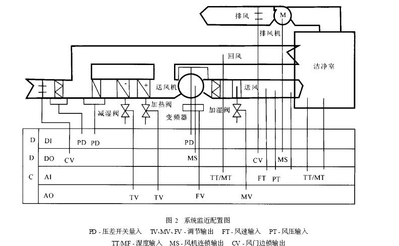 2.4狀態(tài)監(jiān)測(cè):風(fēng)機(jī)啟動(dòng)后,風(fēng)機(jī)兩側(cè)壓差超過(guò)設(shè)定值時(shí),風(fēng)機(jī)DP開(kāi)關(guān)閉合,信號(hào)輸入系統(tǒng),控制程序投入運(yùn)行。同時(shí)風(fēng)門及電動(dòng)調(diào)節(jié)閥送電。反之,當(dāng)風(fēng)機(jī)停止后風(fēng)門及電動(dòng)調(diào)節(jié)閥關(guān)閉。通過(guò)風(fēng)機(jī)過(guò)載繼電器狀態(tài)監(jiān)測(cè),產(chǎn)生風(fēng)機(jī)故障報(bào)警信號(hào)(D D。通過(guò)空調(diào)控制柜的二次回路監(jiān)測(cè)風(fēng)機(jī)的運(yùn)行狀態(tài)信號(hào)(DD。通過(guò)與變頻器指定接線端的連接,監(jiān)測(cè)變頻器故障報(bào)警信號(hào)(D D、變頻器運(yùn)行狀態(tài)信號(hào)(DI)、變頻器頻率反饋信號(hào)(DI)。通過(guò)安裝微差壓傳感器(QBM 63/100)監(jiān)測(cè)房間送風(fēng)口高效過(guò)濾網(wǎng)的壓差(AI)。通過(guò)安裝壓差開(kāi)關(guān)QBM81 -5,監(jiān)測(cè)空調(diào)機(jī)組上粗效和中效過(guò)濾網(wǎng)兩側(cè)壓差(2*D I),根據(jù)預(yù)先設(shè)定的壓差限值產(chǎn)生阻塞報(bào)警信號(hào),提示清洗過(guò)濾網(wǎng),提高過(guò)濾效率。一般壓差設(shè)定值為20:-500Pa,可根據(jù)不同機(jī)組調(diào)整報(bào)警范圍。
