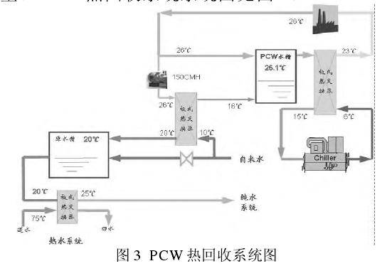 (3)PCW 熱回收改造前,冬季低溫的自來(lái)水原水需由蒸汽加熱到 25℃才能進(jìn)入純水的制造流程中。PCW 節(jié)能改造,是利用原需要冷凍水降溫的 PCW循環(huán)從產(chǎn)設(shè)備產(chǎn)生熱量。僅僅是增加一臺(tái)板式熱交換器和循環(huán)泵,實(shí)現(xiàn)提升原水溫的目標(biāo)。一方面節(jié)約了蒸汽耗量,同時(shí)一部分 PCW 回水被原水預(yù)冷卻,降低了 PCW 水的溫度,節(jié)約了冷凍機(jī)制冷的耗電量。PCW 熱回收系統(tǒng)系統(tǒng)圖見(jiàn)圖 3。