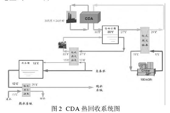 改造前,冬季低溫的自來(lái)水原水需要先由蒸汽加熱到 25℃才能進(jìn)入純水的制造流程中,CDA的節(jié)能改造是利用原需要冷凍水去降溫的CDA機(jī)組產(chǎn)生的熱量。只增加一臺(tái)板式熱交換和循環(huán)泵實(shí)現(xiàn)提升原水箱水溫的目標(biāo),一方面節(jié)約了蒸汽耗量,同時(shí) CDA 冷卻水被原水冷卻,節(jié)約了冷凍機(jī)制冷的耗電量。CDA 熱回收系統(tǒng)見(jiàn)圖 2。