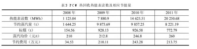 節(jié)能成果,PCW 熱回收系統(tǒng)節(jié)能改造安裝有熱能表,2008 年 12 月投入運(yùn)行使用后,蒸汽用量和冷凍水負(fù)荷明顯降低,節(jié)能成果見(jiàn)表 3。實(shí)際每年運(yùn)行周期為 11 月至次年 4 月,截止至 2011 年11月 ,累 計(jì) 運(yùn) 行 1 8 個(gè) 月 累 計(jì) 節(jié) 約 蒸 汽 量 為29 596.37 t,折合標(biāo)煤為 2 782.06 t,節(jié)約蒸汽費(fèi)用為 701.67 萬(wàn)元。如果不考慮板換的損失,96.37 t,折合標(biāo)煤為 2 782.06 t,節(jié)約蒸汽費(fèi)用為 701.67 萬(wàn)元。如果不考慮板換的損失,節(jié)約的制冷量相當(dāng)于節(jié)約的電量,故冷凍機(jī)節(jié)電量約368.19 萬(wàn) kWh。耗電量實(shí)際每年運(yùn)行周期為 11 月至次年4 月,截至 2011 年 11 月,累計(jì)運(yùn)行18 個(gè)月):水泵耗電量約 19.44 萬(wàn) kWh,綜合節(jié)電量348.75 萬(wàn) kWh,總共節(jié)約費(fèi)用 910.92 萬(wàn)元,總共節(jié)能量折合標(biāo)煤為4 191.01 t。