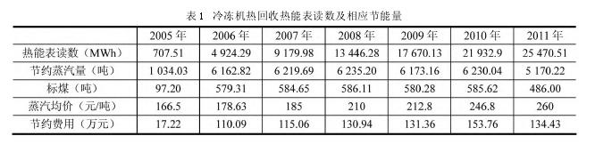 實(shí)際節(jié)能成果,冷凍機(jī)熱回收系統(tǒng)安裝有電能表和熱能表,2005 年 12 月投入運(yùn)行使用后,蒸汽用量明顯降低,節(jié)能效果見(jiàn)表1。累計(jì)節(jié)約蒸汽量為 37225.15 t,折合標(biāo)煤 3499.16 t,節(jié)約蒸汽費(fèi)用為 792.85 萬(wàn)元。冷卻塔風(fēng)扇節(jié)電量 38.88 萬(wàn)kWh,但循環(huán)泵耗電量=191.81 萬(wàn) kWh,所以多耗電 152.93 萬(wàn) kWh,總共節(jié)約費(fèi)用 701.09 萬(wàn)元,折合節(jié)約標(biāo)煤為 2881.33 t。