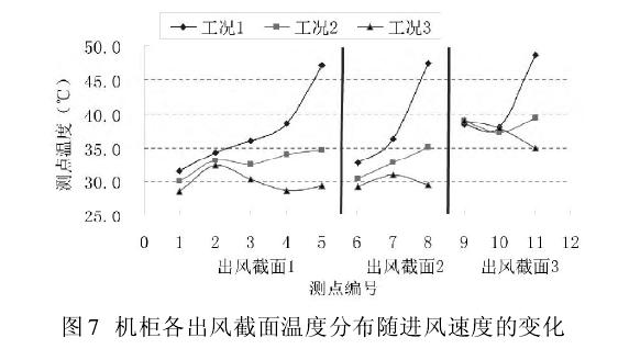 圖7為機(jī)柜各出風(fēng)截面溫度分布隨進(jìn)風(fēng)速度的變化曲線,結(jié)合表 2 可知,隨進(jìn)風(fēng)速度的增大,機(jī)柜出風(fēng)溫度隨之減小,但各出風(fēng)截面上的溫度分布趨勢(shì)隨進(jìn)風(fēng)速度的變化而有所不同。當(dāng)進(jìn)風(fēng)速度為 0.99 m/s 時(shí)(即工況 1),隨著測(cè)點(diǎn)位置的升高,測(cè)點(diǎn) 1 至測(cè)點(diǎn) 5 的溫度(即出風(fēng)截面 1 上的溫度)逐漸升高,從 31.6℃升高至 47.1℃,并且測(cè)點(diǎn) 4 到測(cè)點(diǎn) 5 溫度升高迅速,增加了近8.4℃;測(cè)點(diǎn) 6 至測(cè)點(diǎn) 8 的溫度(即出風(fēng)截面 2 上的溫度)同樣逐漸升高,并且測(cè)點(diǎn) 7到測(cè)點(diǎn) 8的溫度升高迅速,增加了近11.1℃;測(cè)點(diǎn)9至測(cè)點(diǎn)11的溫度(即出風(fēng)截面 3 上的溫度)有先減后增的趨勢(shì),但測(cè)點(diǎn) 10 僅比測(cè)點(diǎn) 9 減少了0.4 ℃,測(cè)點(diǎn) 11 卻比測(cè)點(diǎn)10 增加了將近 11℃。當(dāng)進(jìn)風(fēng)速度為 1.39 m/s 時(shí)(即工況2),隨著測(cè)點(diǎn)位置的升高,測(cè)點(diǎn) 1 至測(cè)點(diǎn) 5的溫度以及測(cè)點(diǎn) 6 至測(cè)點(diǎn)8 的溫度均逐漸升高,分別從 29.9℃增高到34.8℃和 30.4℃增高到35.2℃,但升高趨勢(shì)均較工況1小,并且沒(méi)有明顯的溫升現(xiàn)象;測(cè)點(diǎn) 9 至測(cè)點(diǎn)11 的溫度分布出現(xiàn)先減后增的現(xiàn)象,但兩測(cè)點(diǎn)間溫差不大,約 2.0℃。當(dāng)進(jìn)風(fēng)速度為 2.0 m/s 時(shí)(即工況3),隨著測(cè)點(diǎn)位置的升高,測(cè)點(diǎn) 1至測(cè)點(diǎn) 5的溫度分布基本呈現(xiàn)先增后減再增的現(xiàn)象,但在機(jī)柜上部出風(fēng)溫度隨之變化較小,最高溫度為 32.3℃,最大溫差為3.7℃;測(cè)點(diǎn)6 至測(cè)點(diǎn) 8 的溫度分布呈現(xiàn)先增后減的現(xiàn)象,最高溫度為30.9℃,最大溫差為1.7℃,出風(fēng)截面 1 和2 上各測(cè)點(diǎn)間溫差較小,溫度分布較均勻,沒(méi)有明顯的溫升現(xiàn)象;測(cè)點(diǎn)9至測(cè)點(diǎn)11的溫度分布出現(xiàn)逐漸減小的現(xiàn)象,測(cè)點(diǎn)11比測(cè)點(diǎn)9溫度減小了約6.0℃。