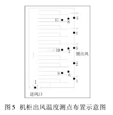 機(jī)柜進(jìn)、出風(fēng)溫度測(cè)點(diǎn)布置如圖5所示。其中,機(jī)柜出風(fēng)溫度的 1-5 測(cè)點(diǎn)由下至上距機(jī)柜底板距離分別約為 300 mm,700 mm,1100 mm,1500mm,1900 mm;6-8 測(cè)點(diǎn)距通信設(shè)備 230 mm左右,布置在機(jī)柜2、5、9層中間位置;9-11測(cè)點(diǎn)距通信設(shè)備50 mm,布置在機(jī)柜 2、5、9層的通信設(shè)備正前方位置。