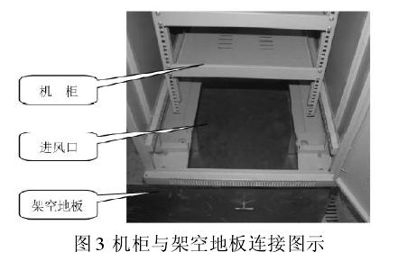 機(jī)柜安置于架空地板上,如圖3所示,其尺寸為:(高)2200 mm ×(深)1200 mm ×(寬)600 mm,屬于標(biāo)準(zhǔn)機(jī)柜,機(jī)柜內(nèi)部共有 10 臺(tái) 500W的模擬通信設(shè)備(可通過(guò)穩(wěn)壓電源調(diào)整機(jī)柜的功率),兩者上下間距約200 mm,共有 10 層。機(jī)柜采用下送風(fēng)側(cè)出風(fēng)的氣流組織形式,在機(jī)柜內(nèi)部的前端留有假想冷風(fēng)道,機(jī)柜進(jìn)風(fēng)口位于冷風(fēng)道的下部,其結(jié)構(gòu)尺寸為:360 mm×630 mm,可通過(guò)擋板調(diào)整進(jìn)風(fēng)口的大小,機(jī)柜內(nèi)的熱空氣從后面排出,后面板開(kāi)孔率為 40%。另外,在進(jìn)風(fēng)口旁安裝有擋風(fēng)盲板,防止冷空氣直接從機(jī)柜底部流向后面。